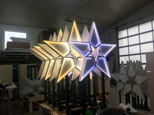 The illumination of the stars is based on digital LEDs that can be adressed individually and reproduce many millions of differently tuned colors. So finely composed light sequences can be called up for different occasions.