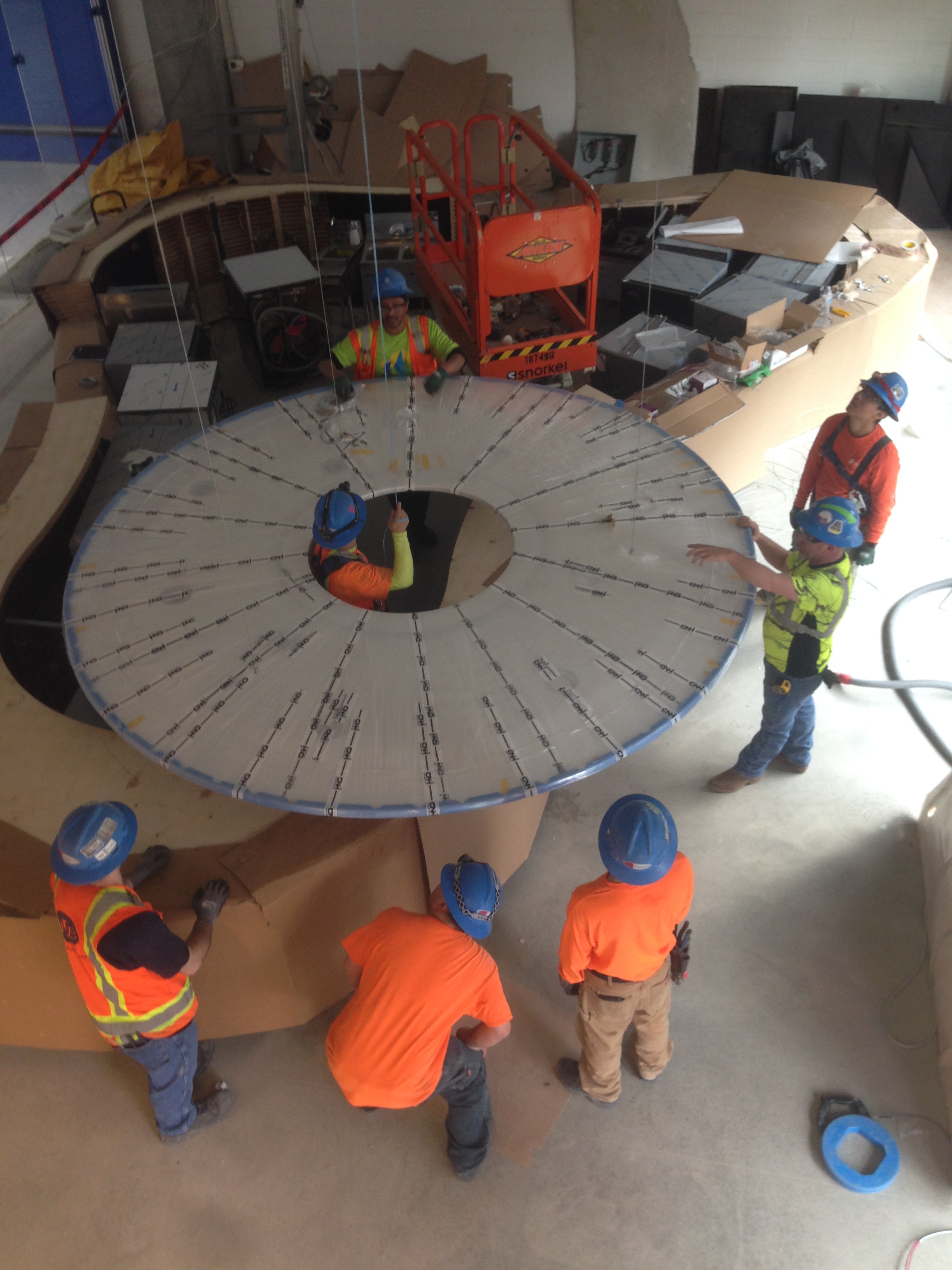 The discs are handmade unique pieces realized in collaboration with skilled scenery builders.